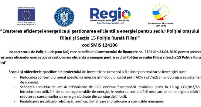 Inspectoratul de Poliție Județean Dolj este beneficiarul contractului de finanțare nr. 5192 din 23.03.2020 pentru proiectul „Creșterea eficienței energetice și gestionarea eficientă a energiei pentru sediul Poliției orașului Filiași și Secția 15 Poliție Rurală Filiași”.