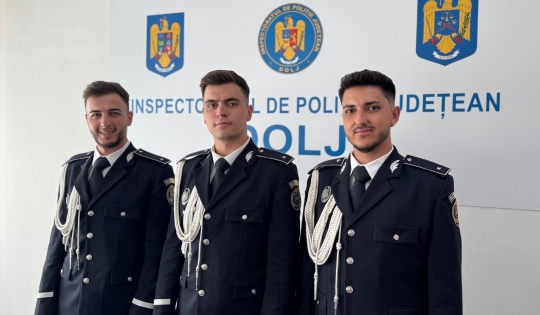 Începând de astăzi, 31 iulie, 3 tineri ofițeri, absolvenți ai Academiei de Poliție ,,Alexandru Ioan Cuza”, promoția 2025, se alătură echipei Inspectoratului de Poliție Județean Dolj.