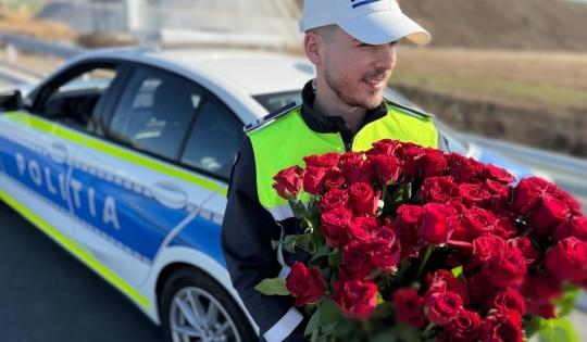 Poliţiştii rutieri sunt ,,înarmați" cu flori, felicitări și zâmbetele din dotare, pentru a transmite doamnelor și domnișoarelor participante la traficul rutier, urări cu ocazia Zilei de 8 Martie și recomandări pentru siguranța rutieră.