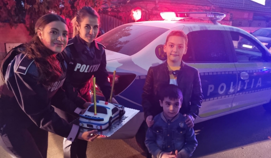 Pare o poveste, dar de fapt, aceasta este prima interacţiune dintre poliţişti şi părinţii sărbătoritului de 9 ani. Colegii noştri au indentificat barbatul care, la data de 27 octombrie a.c., ar fi sustras bunuri dintr-un magazin unde lucrează mama sărbătoritului, iar aceasta le-a insuflat sentimentul de apreciere pentru felul în care polițiștii și-au desfăşurat activitatea şi copiilor, ceea ce i-a determinat să-şi dorească foarte mult să îi cunoască.