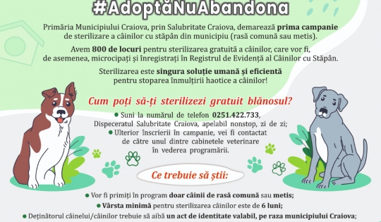 Inspectoratul de Poliție Județean Dolj – Biroul pentru Protecția Animalelor se alătură demersului întreprins de Primăria Craiova prin S.C. Salubritate Craiova S.R.L. în vederea desfășurării unei campanii de sterilizare a câinilor de rasă comună sau metis, parte a eforturilor comune de gestionare responsabilă a animalelor.
